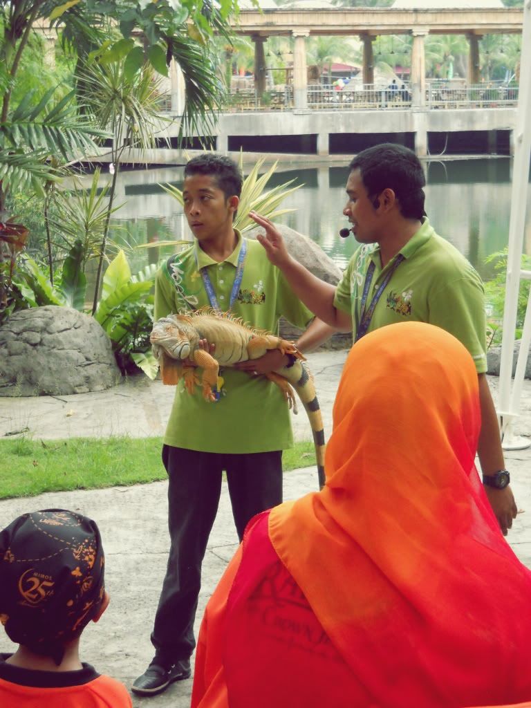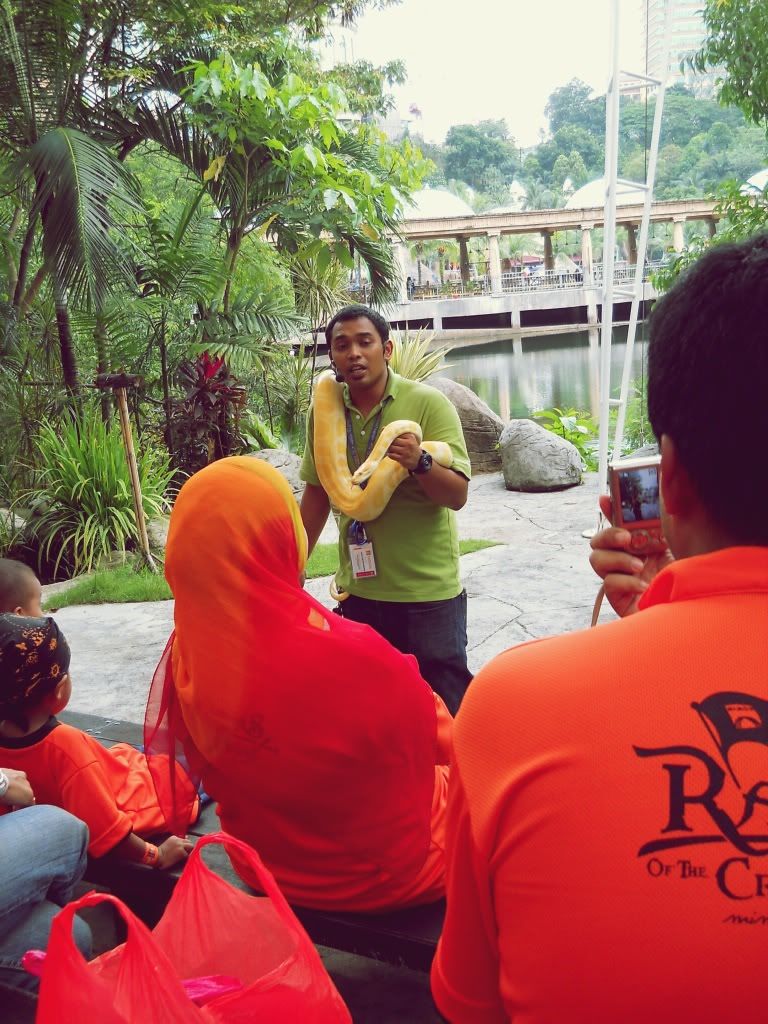 Dah sampai kat sini, tetiba nampak ada orang wat Animal Show. Tak ramai sangat orang, so kitorang pun tumpang sekaki. Abang tuhh ngah pegang ular albino. Alahh mesti korang dah tau punya. Dah puas abang tu bebel, dia panggil volunteer pegang ular tu. Kalau Paah ada time tu, dah lama aku tolak-tolak Paah pergi depan. Maunya meraung! KIH KIH. Lastly, takde sape volunteer. So abang tu pun pilih. Aku dah gabra dah bila dia datang dekat dengan aku and Kak Nurul. Kak Nurul duduk hujung sekali, aku sebelah dia. Sekali dia bawak menatang tu, berdiri tepi Kak Nurul. Aku? AMAZED. Waa~